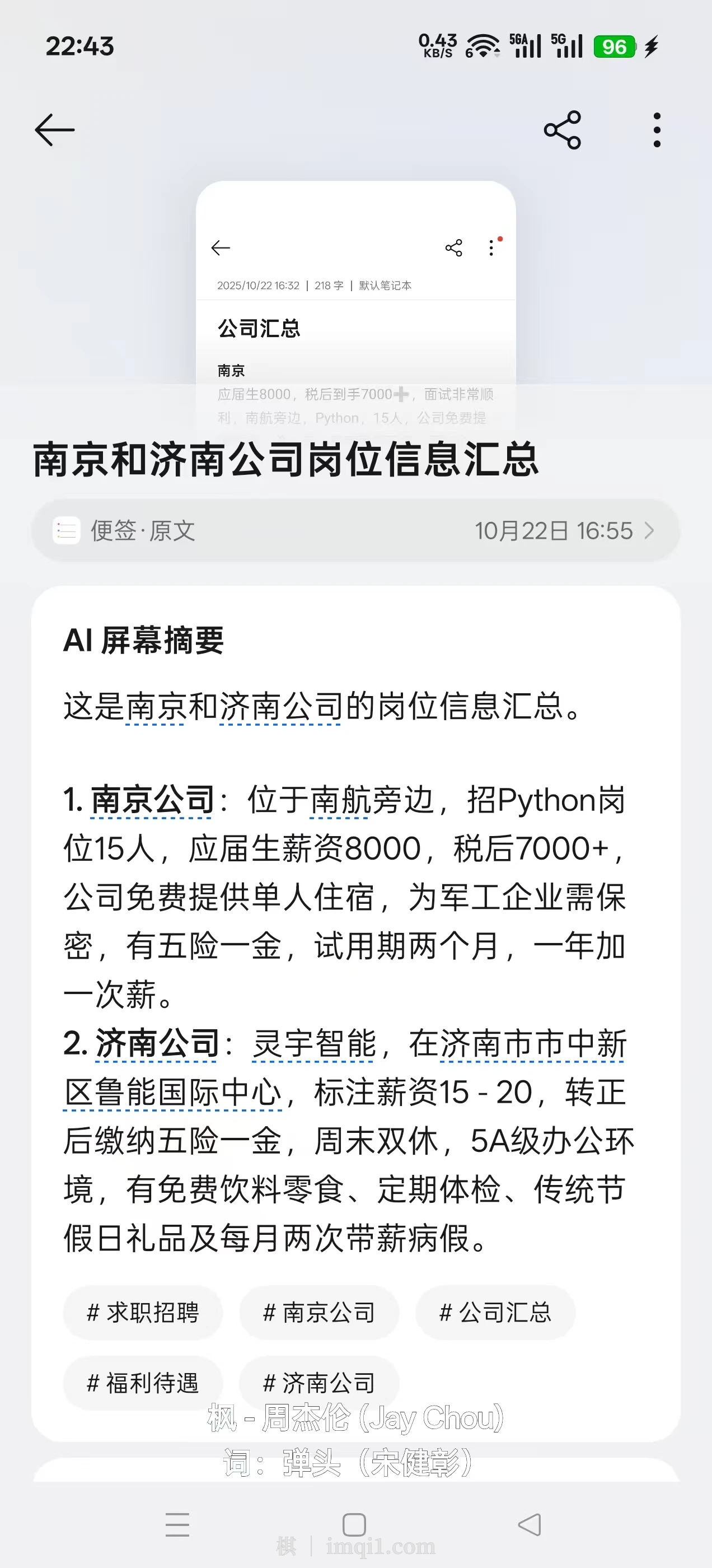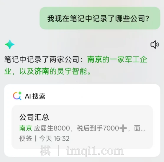 我前天已经正式提出离职,这几天陆陆续续有很多公司面试,我将它们的有关信息存放在笔记里了,然后再存在小布记忆中。小布可以读取记忆中的内容,当我问起时,它能够给我总结出这个信息。这些面试我通过小布语音助手存放在日程中,它也能直接读取。